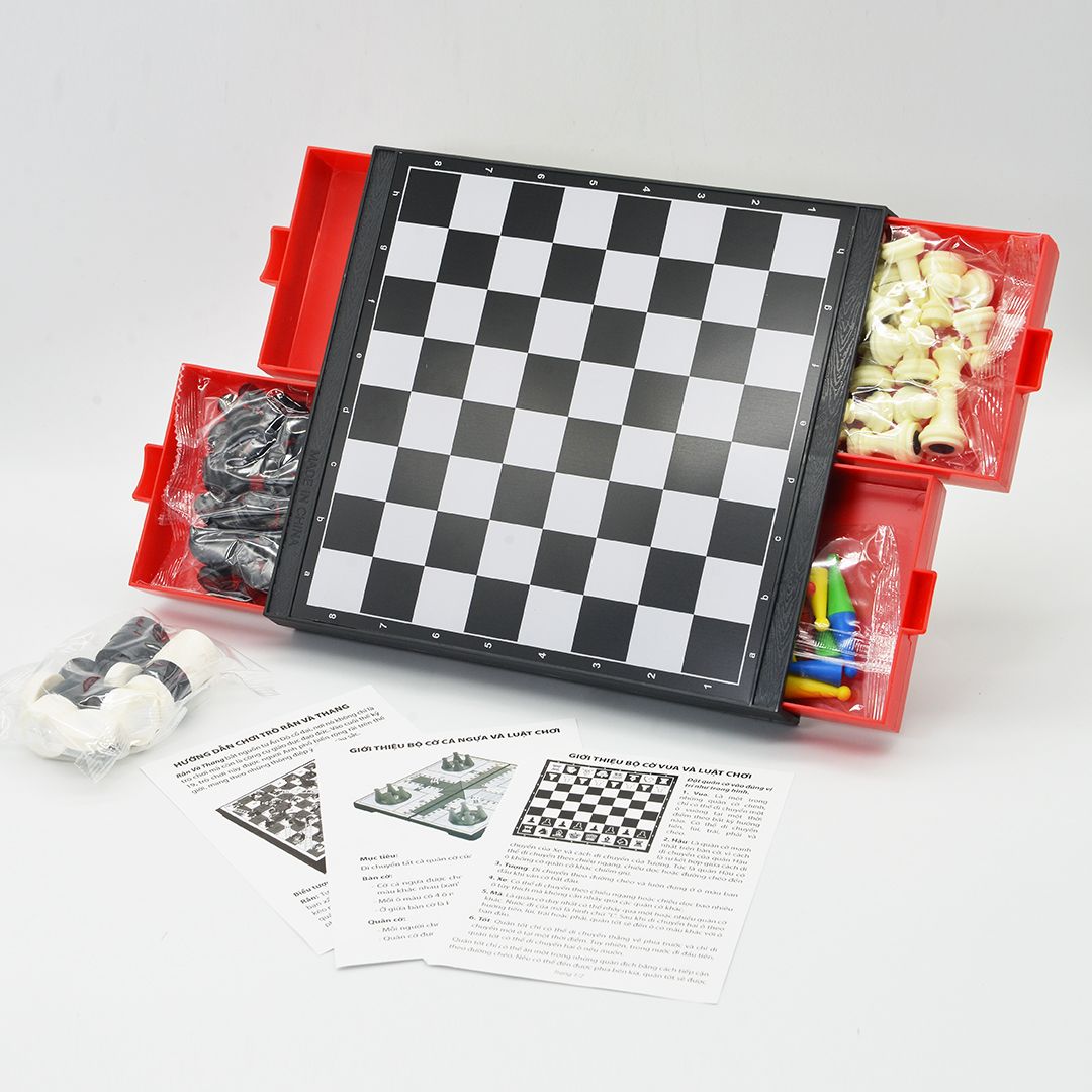 Bàn cờ 3 trong 1 được tích hợp trong 1 bàn cơ như : Cờ vua, cờ caro, cờ cá ngựa giúp các bé thỏa sức thi triển và trải nghiệm các bộ môn đầy trí tuệ và sáng tạo này.