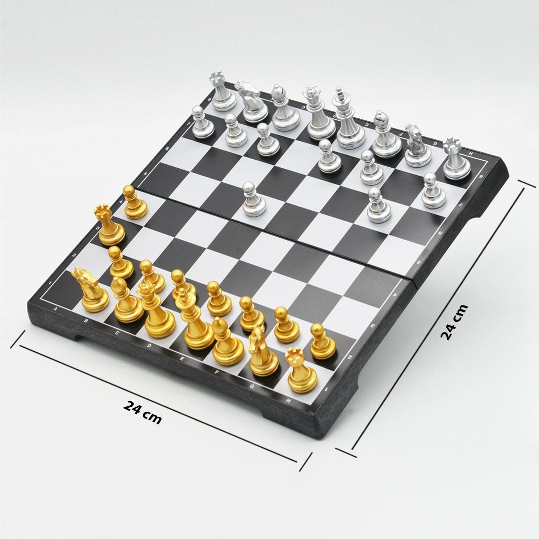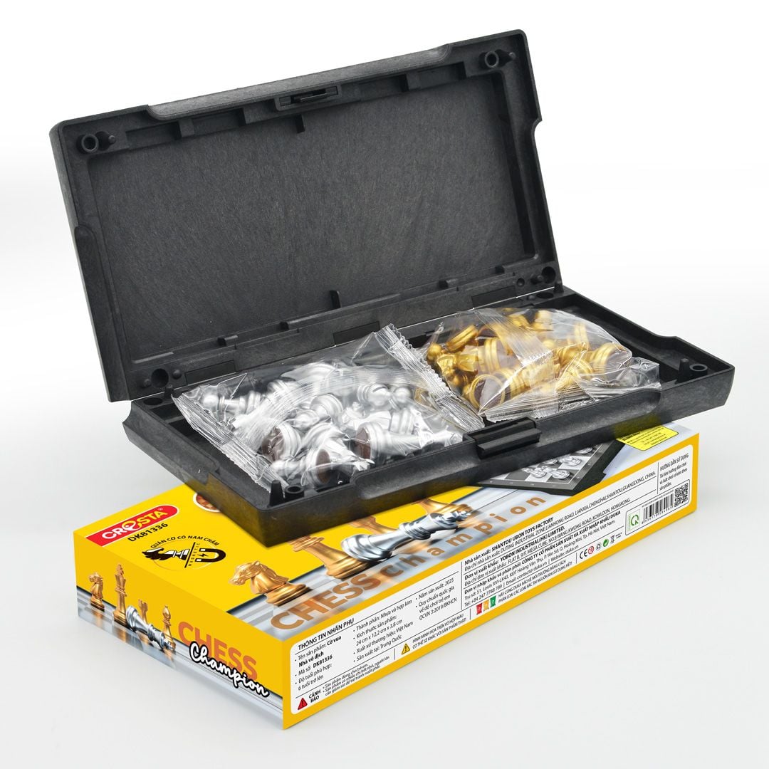 Với chất liệu nhựa ABS an toàn, bàn cờ được thiết kế trơn nhẵn, không góc cạnh, quân cờ được phủ lớp nhũ vàng, bạc bắt mắt, các quân cờ và bàn cờ được tráng một lớp từ tính (nam châm), để giúp khi chơi không bị đổ.